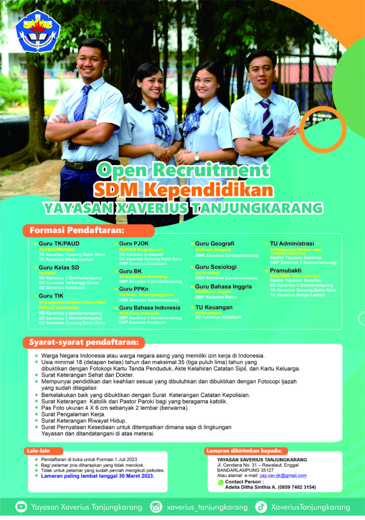 Ayo Gabung Bersama Kami Open Reqruitment SDM Kependidikan Yayasan Xaverius Tanjung Karang